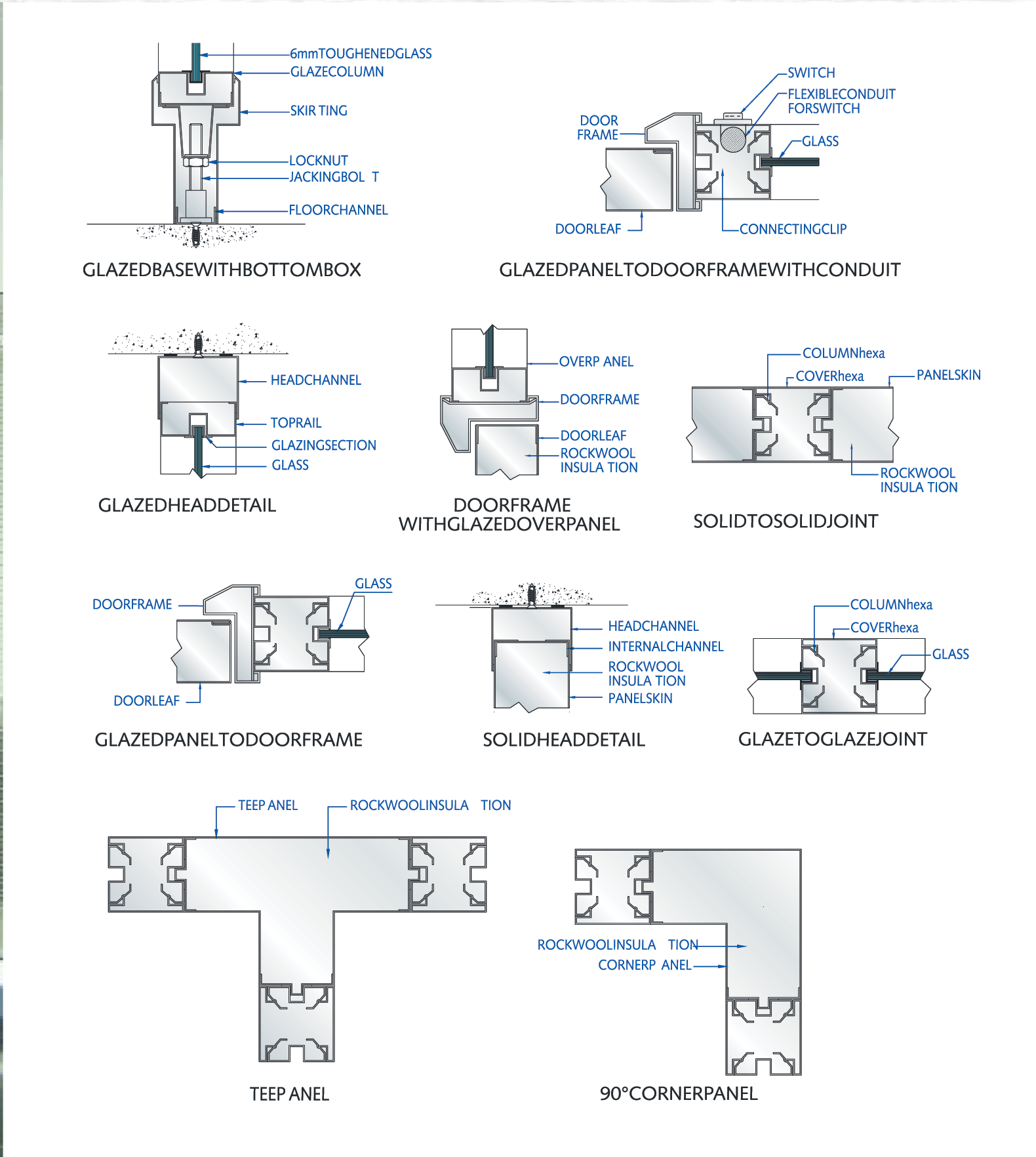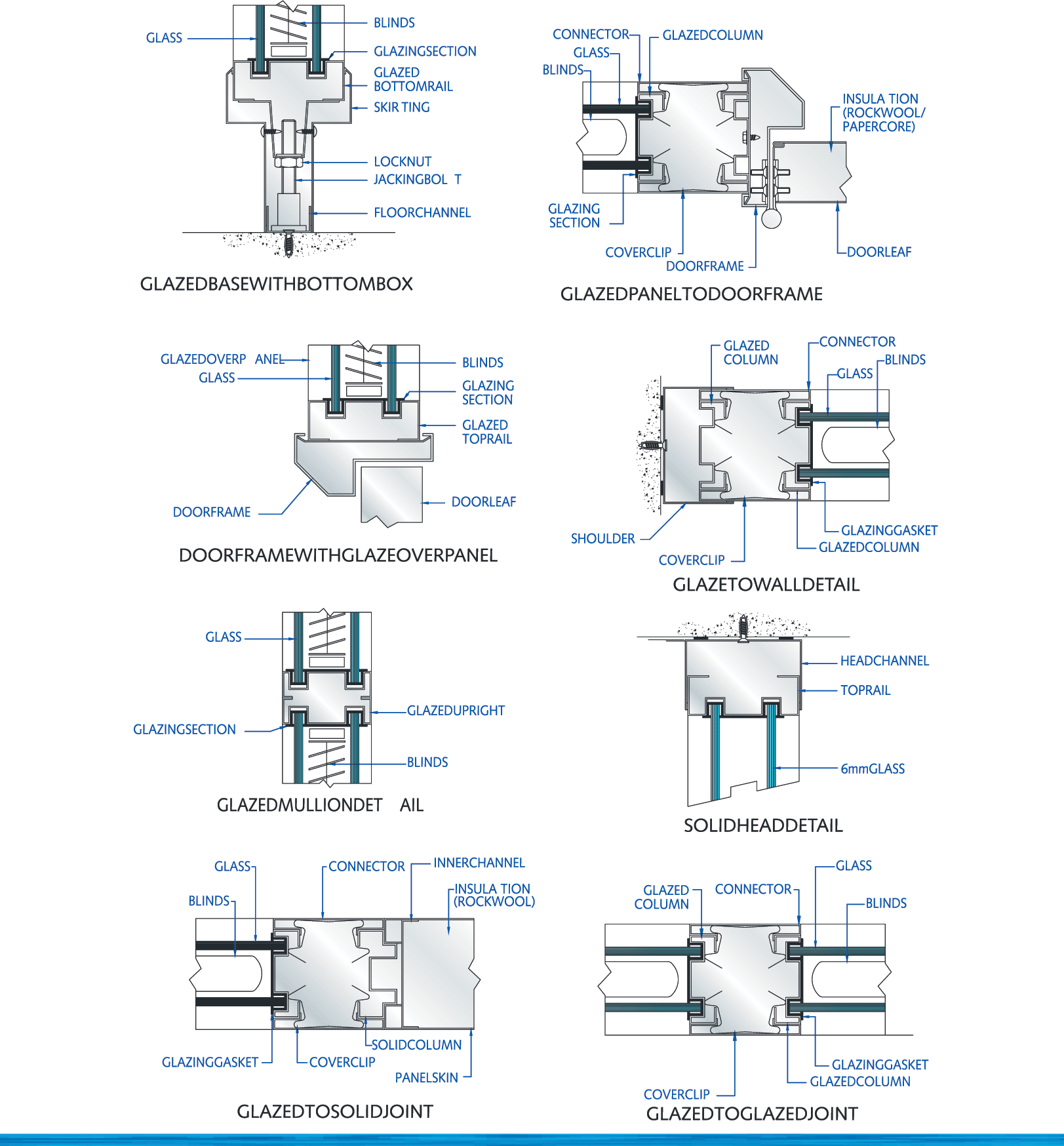 Our demountable office partition systems are suitable for all types of office applications and offer a diverse range of panel options. Panel options range from solid to mid, half and full height single glazed and mid, half and full height double glazing complete with integral venetian blinds. Various aesthetic formats can be achieved employing standard details, with alternative jointing methods, finishes, skirting and head details. |